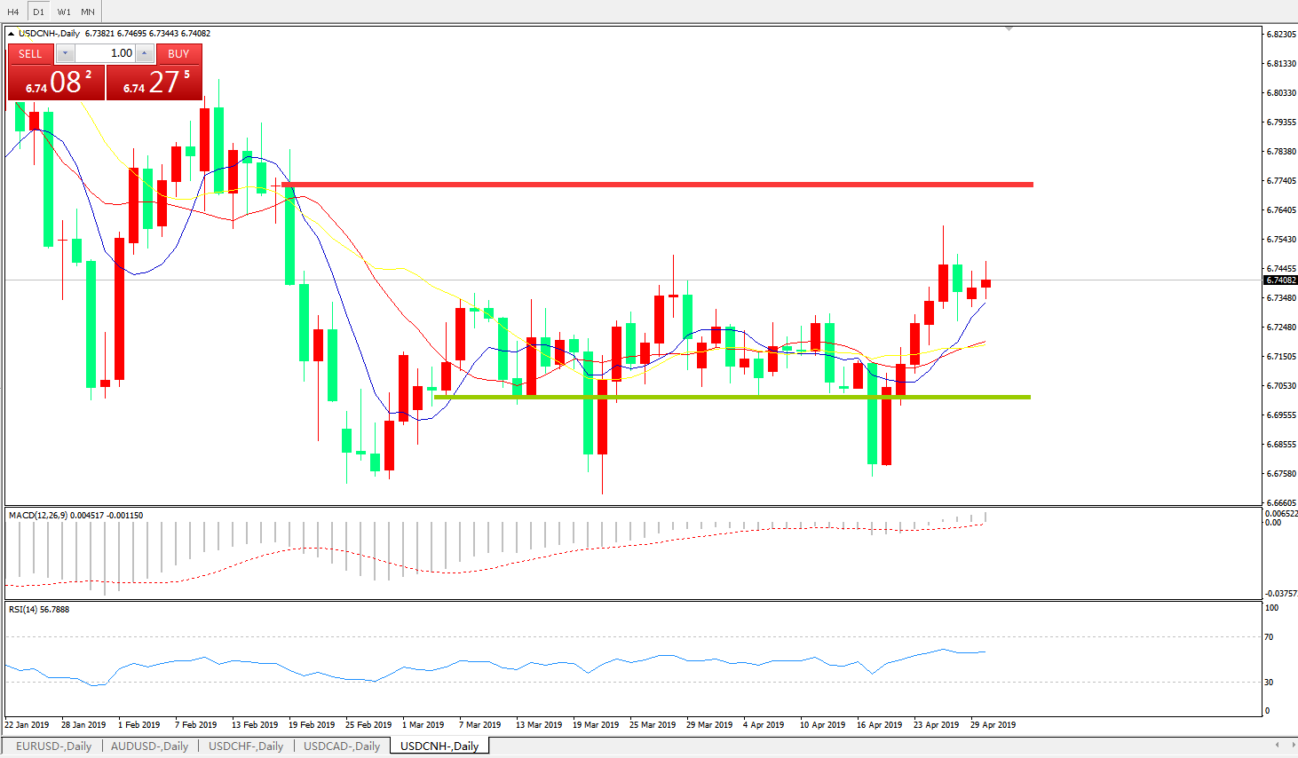 交易策略: 在6.6990之上,看涨,目标价位为6.7845,然后为6.8185。
