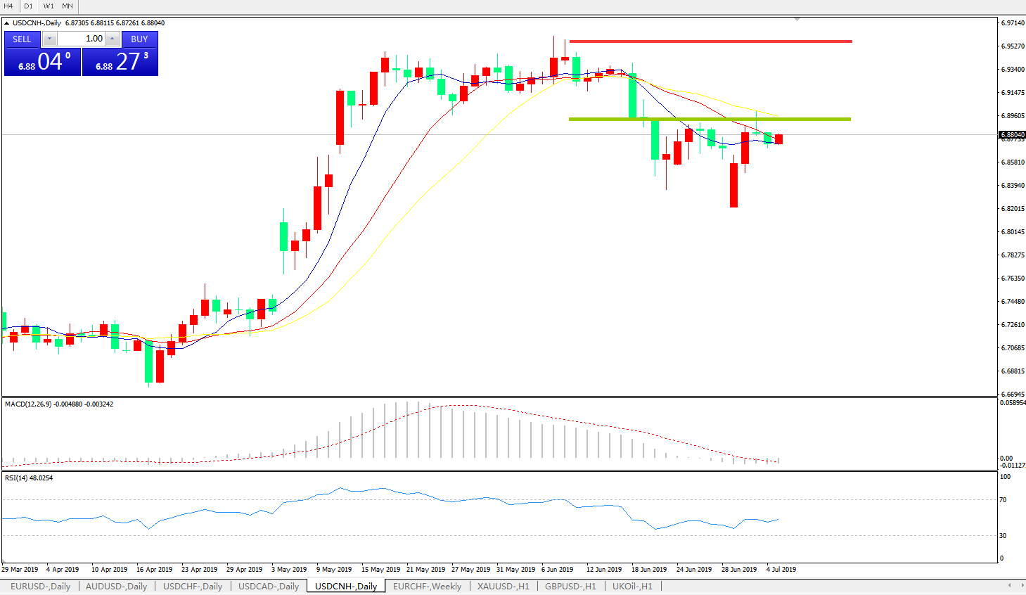 交易策略: 在6.9000之下,看跌,目标价位为6.8100,然后为6.7600。