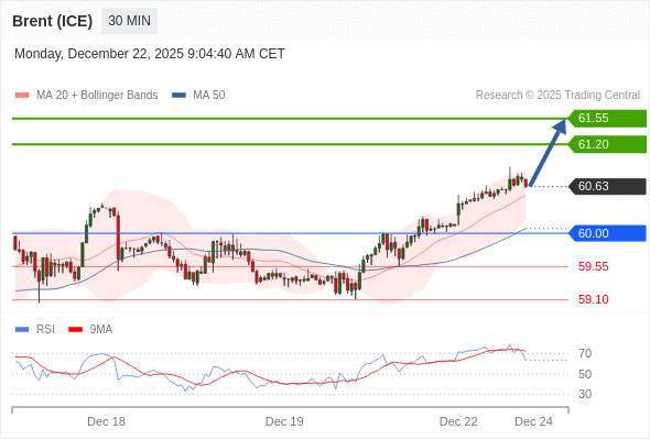 在 60.00 之上,看涨,目标价位为 61.20 ,然后为 61.55 。