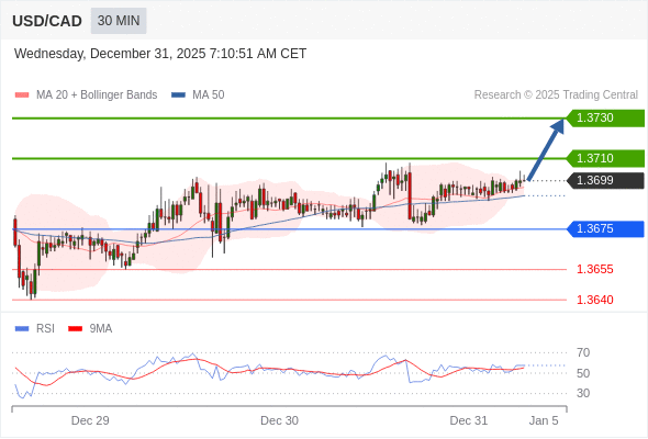 在 1.3675 之上,看涨,目标价位为 1.3710 ,然后为 1.3730 。