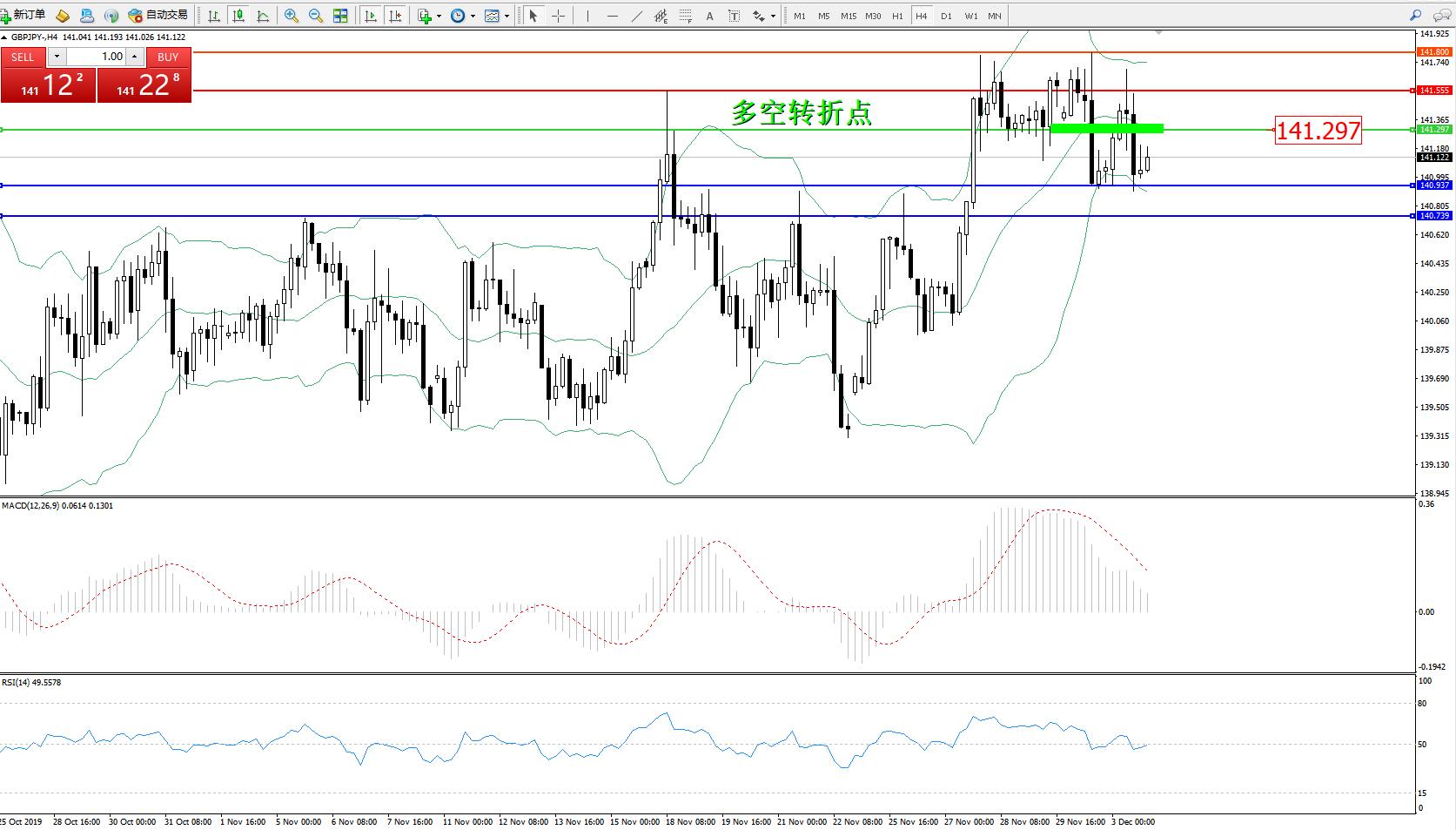 交易策略:141.297下方看跌,目标140.937、140.739
