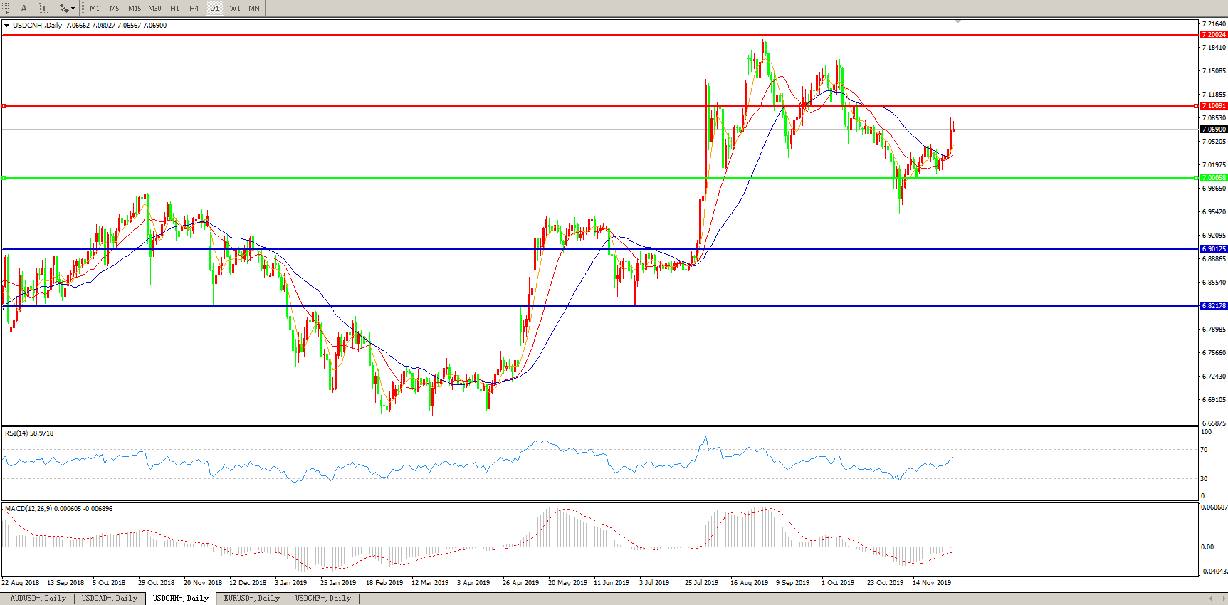 技术面简析:日图均线呈有序多头排列,汇价开始上行冲击7.10关口,MACD自0轴下方快速上行且量能持续收缩,RSI缓步走升,预计短期汇价将企稳7.0关口并逐步上攻,中期汇价需等待中美贸易谈判最新进展指引。