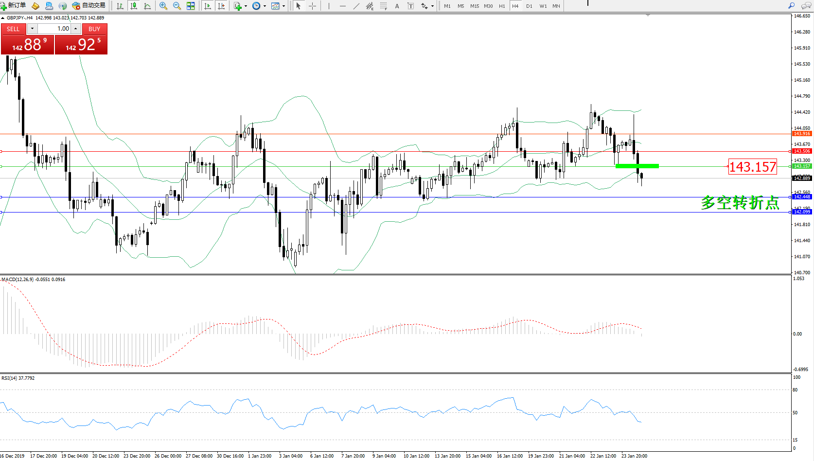 备选策略:143.157上方看涨,目标143.506、143.916