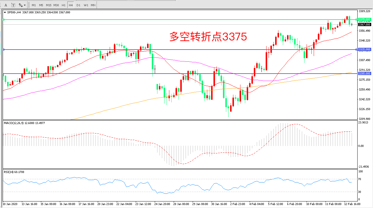4小时图看,标普连续走高整体表现强势,均线系统多头排列,MACD红柱增加,RSI指标向下,日内震荡上行概率较大