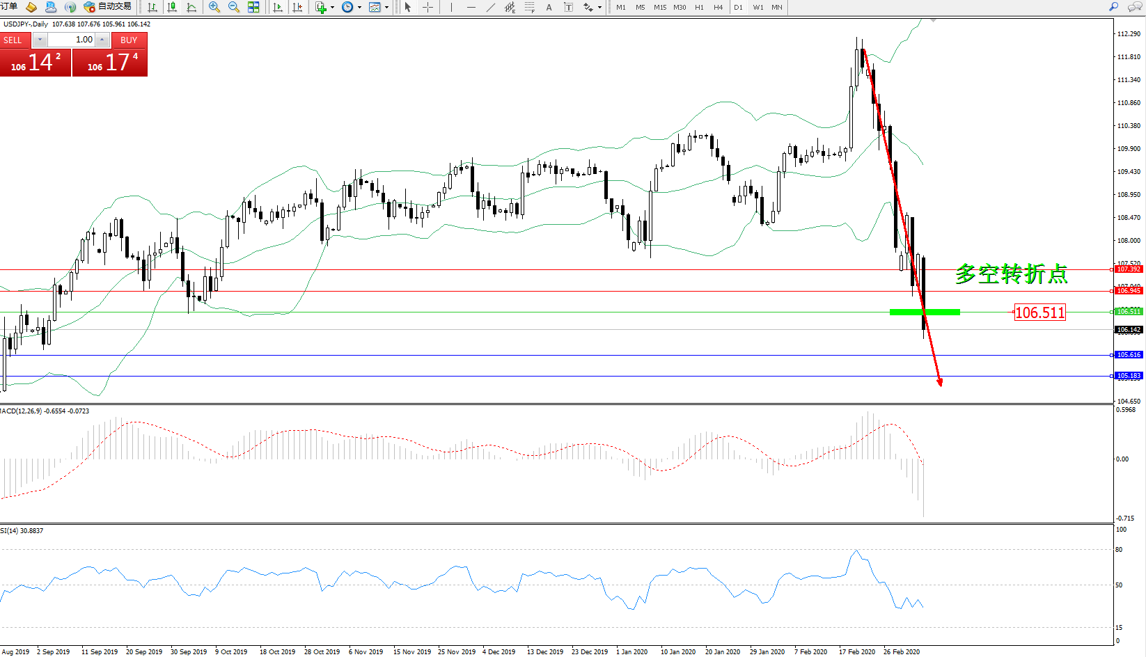 交易策略:106.511下方看跌,目标105.616、105.183