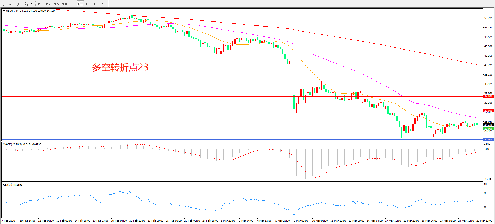 4小时图看,美油以23美元为支撑进行整理,整体出现止跌迹象,短期均线系统拐头,MACD绿柱减少,RSI指标走平,日内有可能出现反弹。
