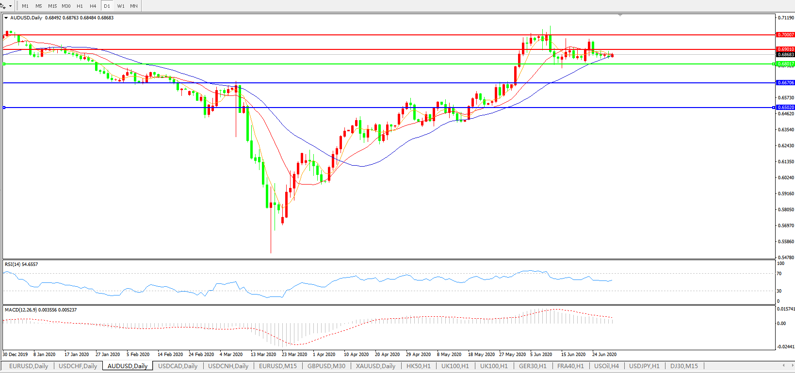 技术面简析:日图短期均线高位粘合走弱,汇价窄幅整理缺乏动能,MACD运行于0轴上方且量能持续缩量,RSI缓步走平,预计汇价短线大概率将继续整理,关注0.6800关口支撑。