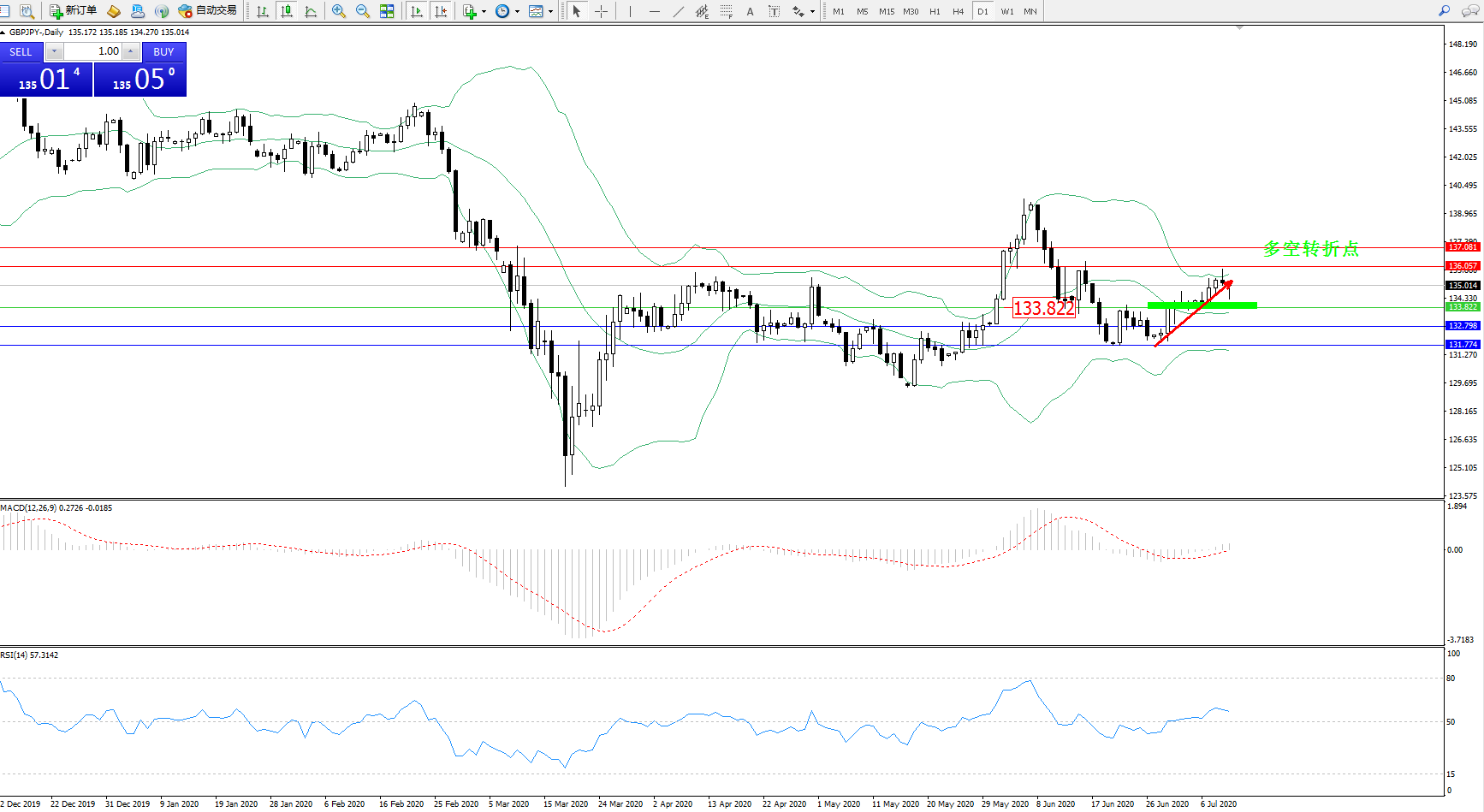 交易策略:133.822上方看涨,目标136.057、137.081