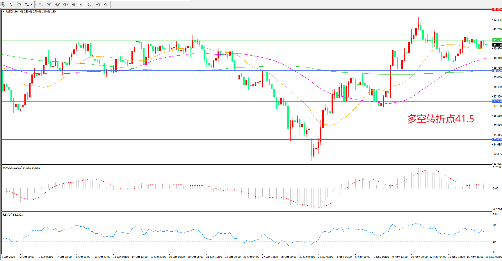周二(11月18日),OPEC+的联合部长级监督委员会并未公布明年的生产建议,多空双方表现谨慎,美国WTI原油振幅逐渐收窄,收报41.25美元/桶。OPEC的“按兵不动”抵消了之前由疫苗研发进度喜人所带来的乐观情绪,目前市场对新冠疫苗乐观进展的趋于理智。