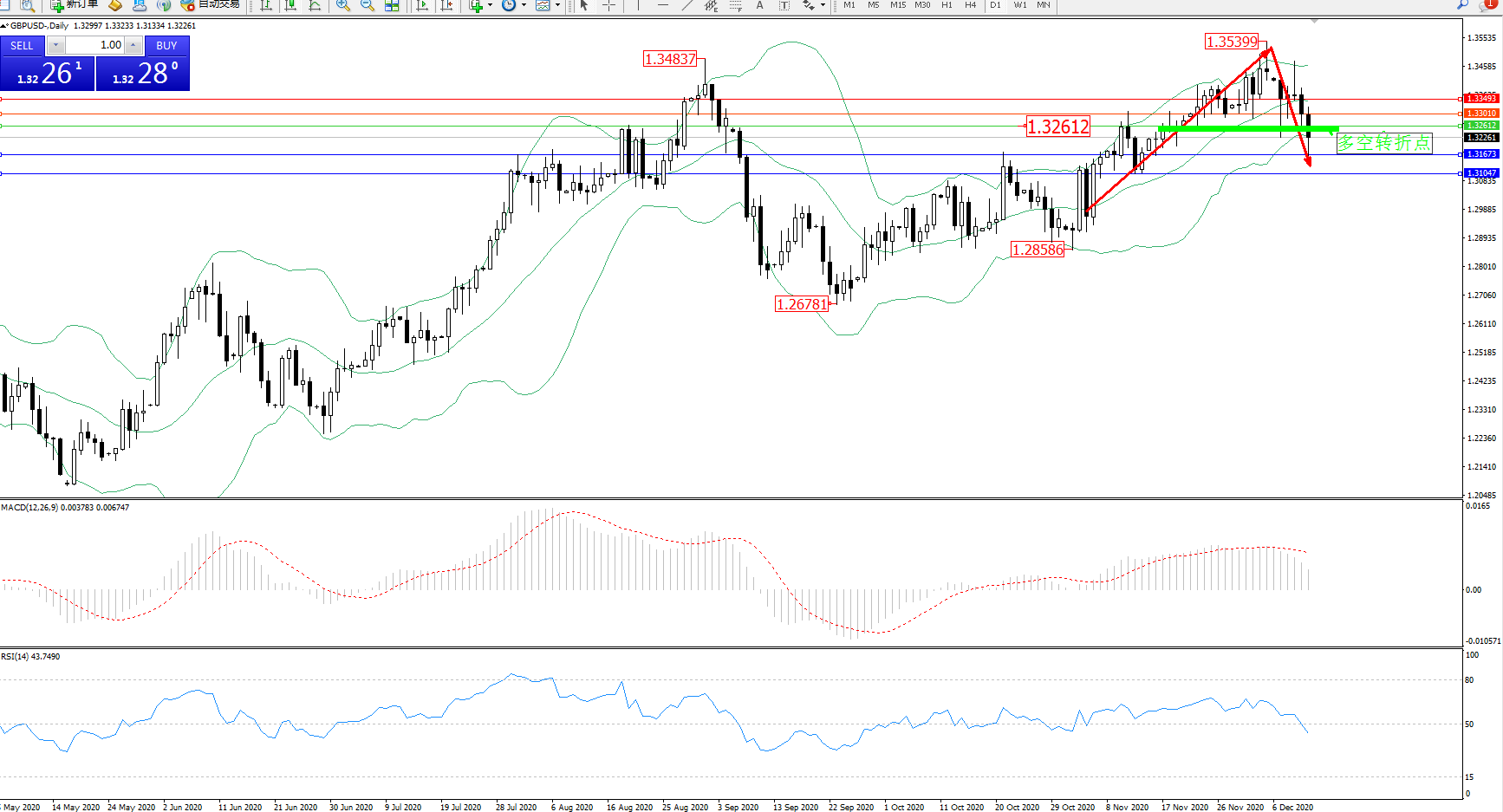 交易策略:1.32612下方看跌,目标1.31673、1.31047