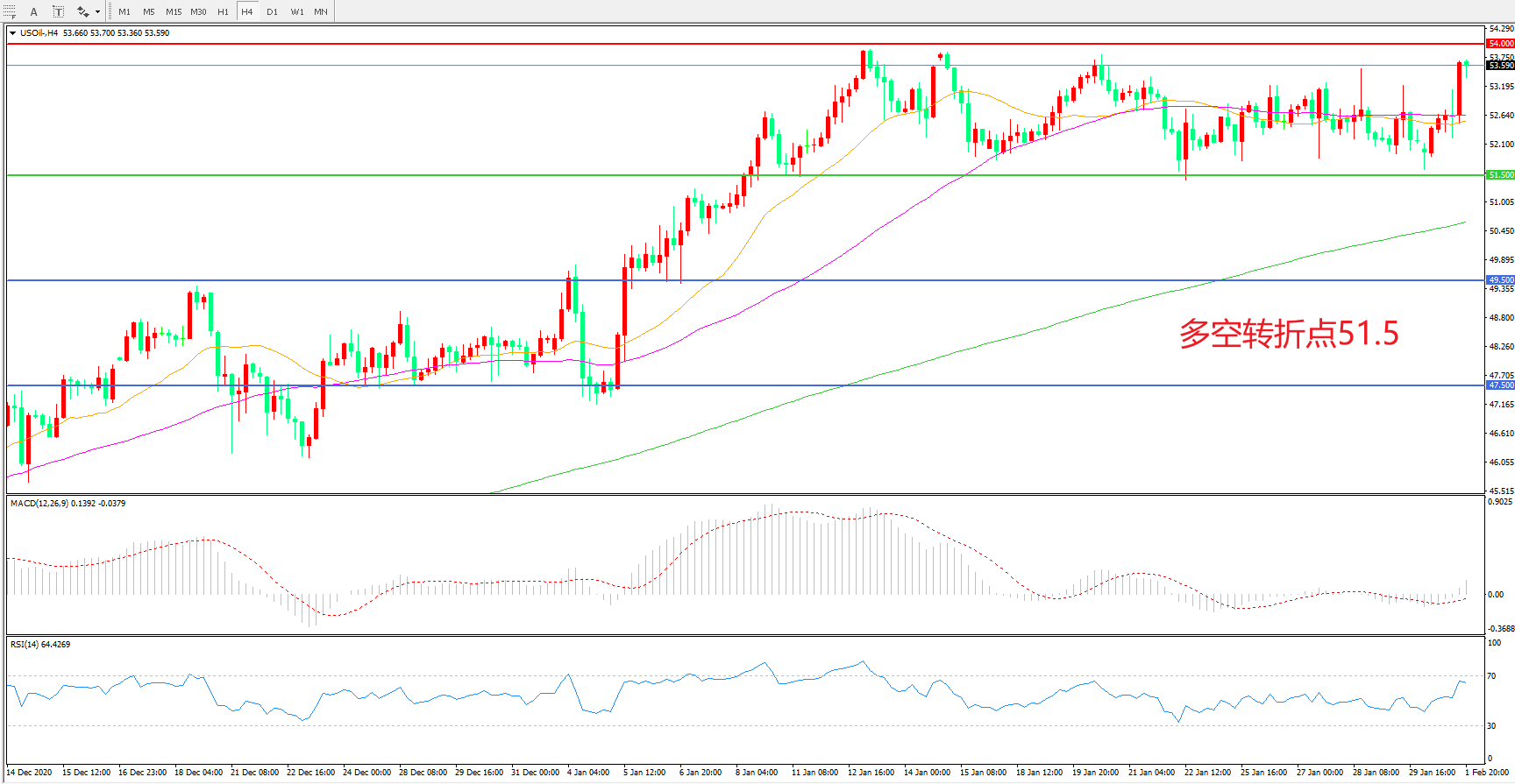 4小时图看,油价以55均线为依托长阳拉升,整体表现偏强,54阻力近在咫尺,如能取得突破,有望迎来新一波拉升,MACD红柱增加,RSI指标向上,日内延续震荡概率较大。