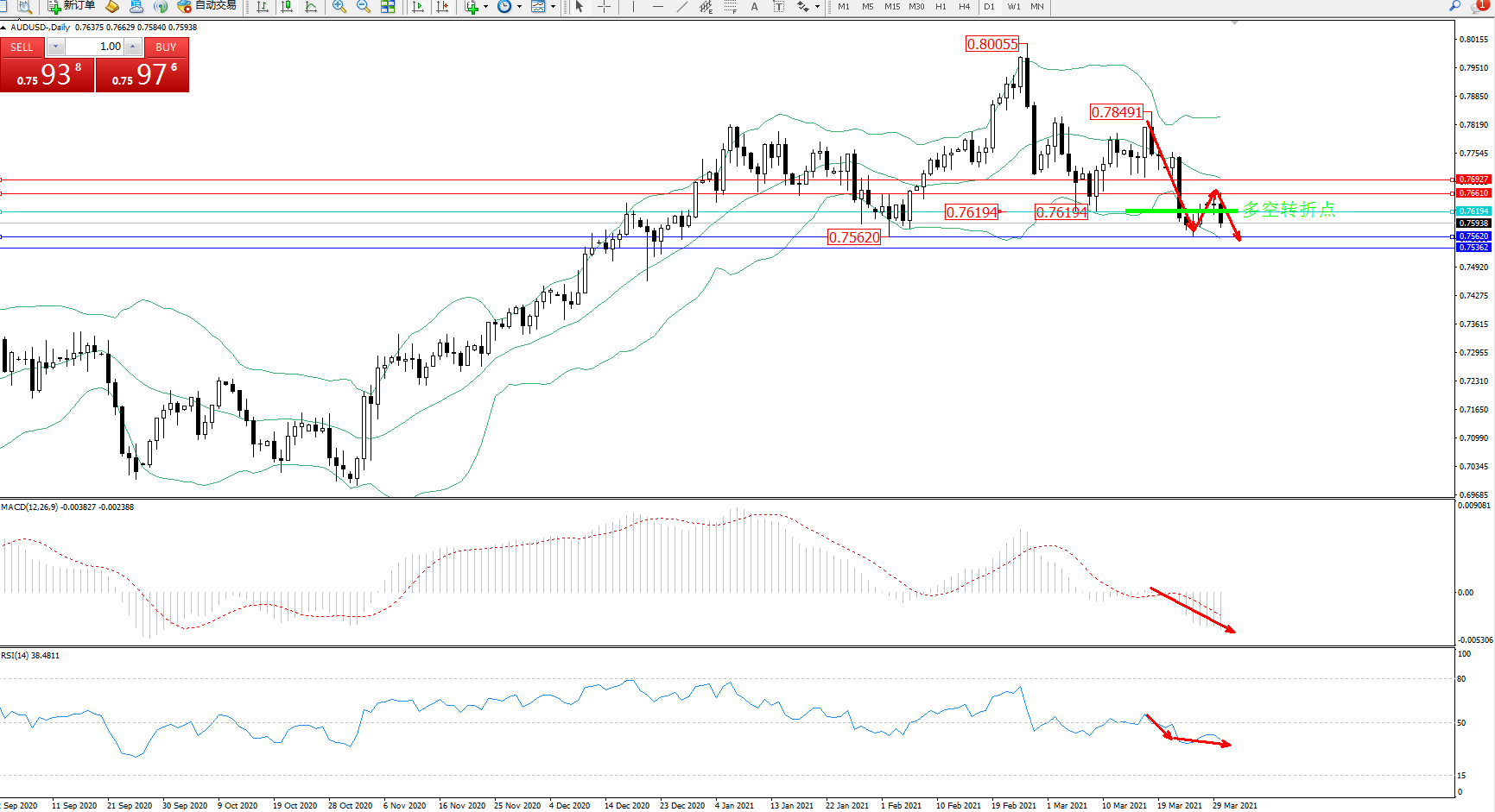 交易策略:0.76194下方看跌,目标0.75620、0.75362