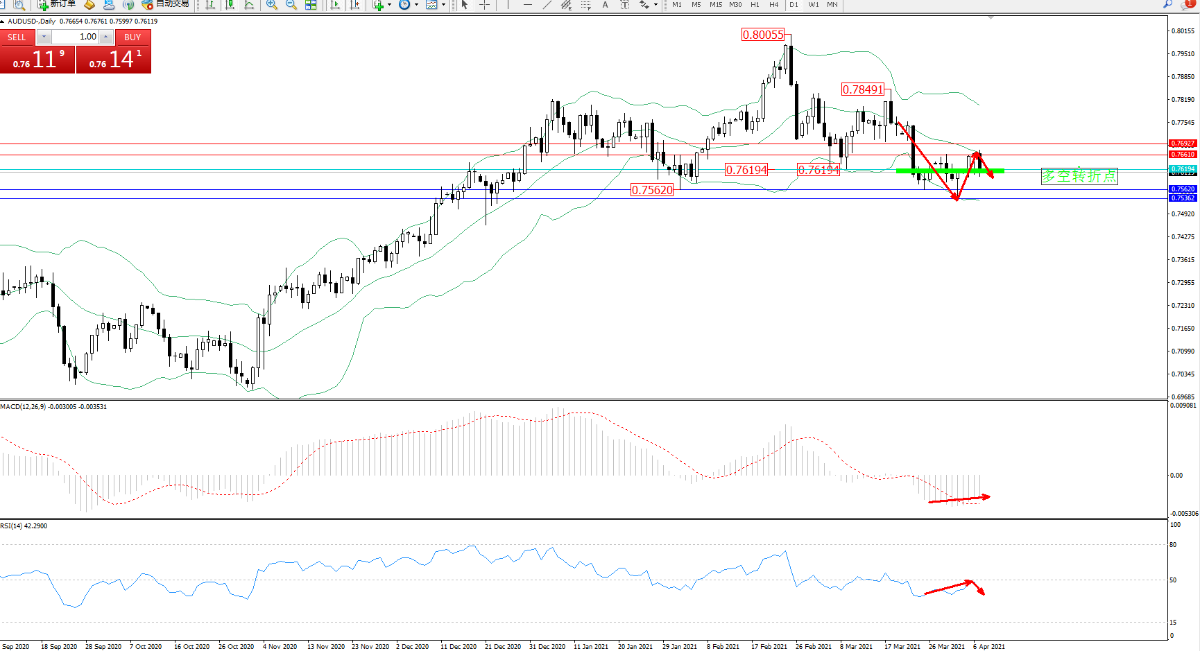 交易策略:0.76194下方看跌,目标0.75620、0.75362