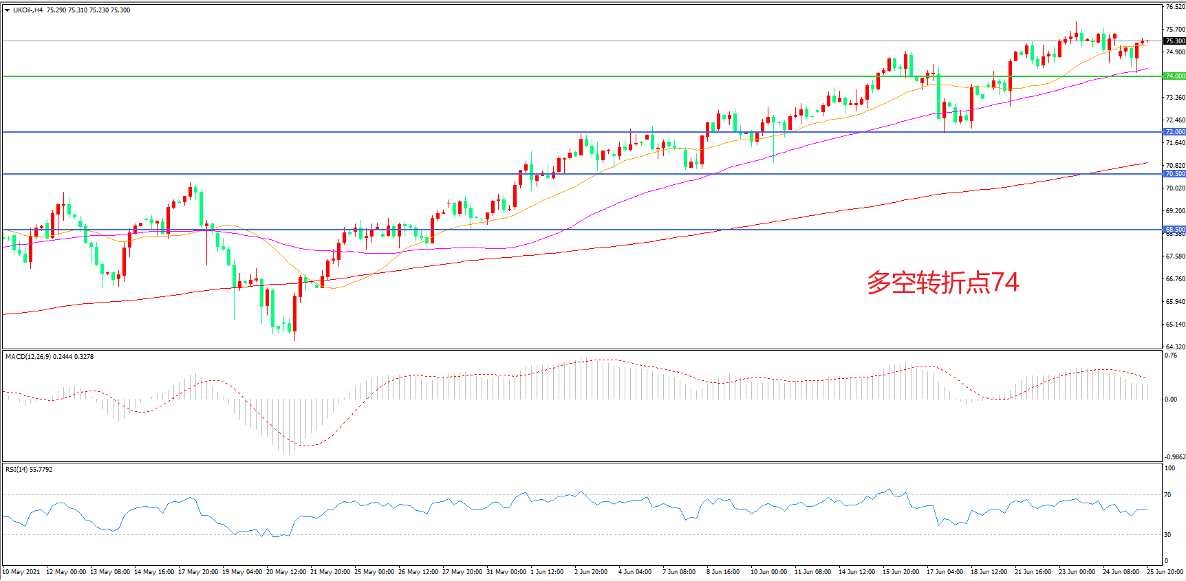 交易策略:在74.00之上看涨,目标77.00    80.00
