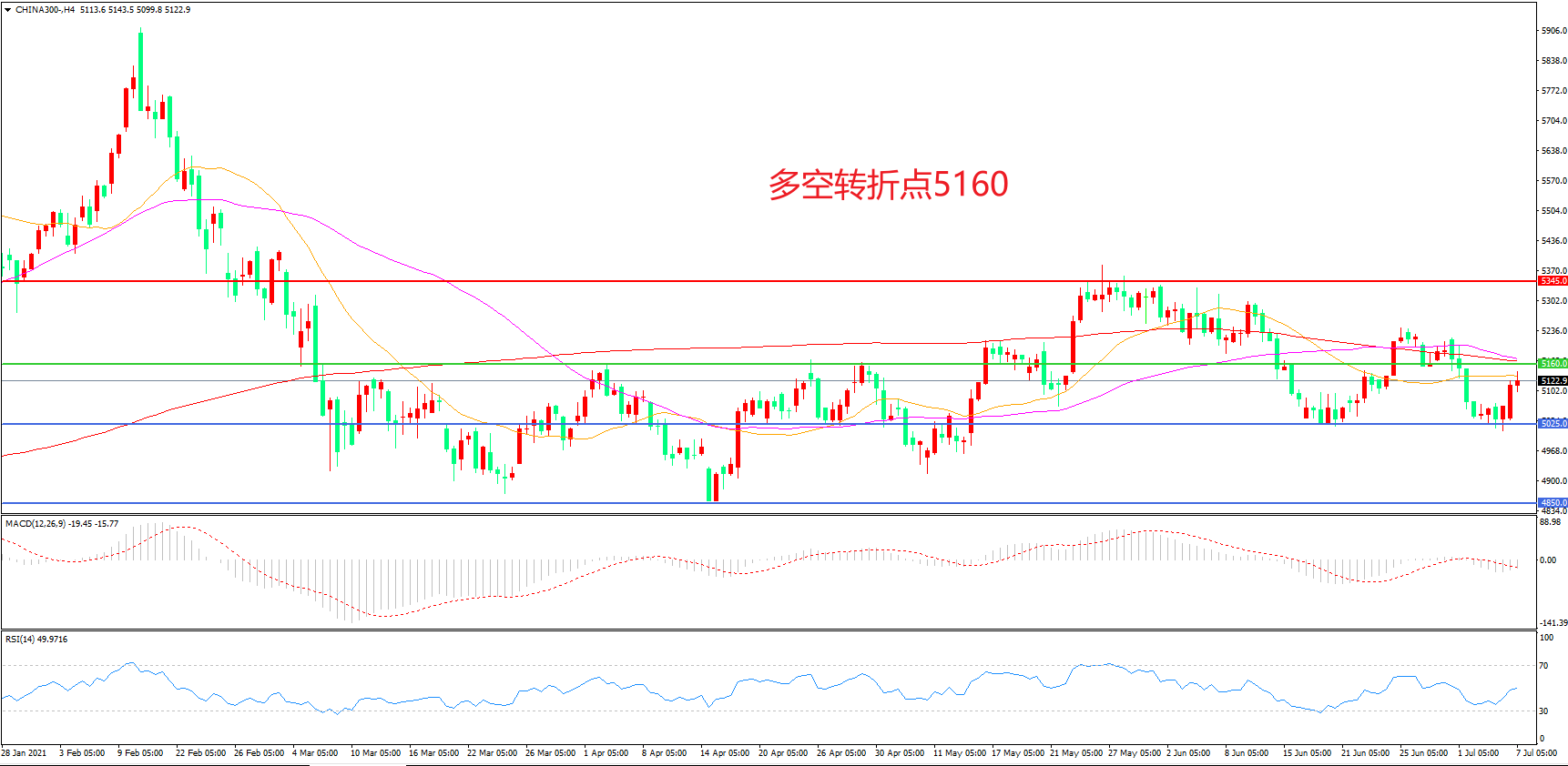 4小时图看,沪深300回踩5025后震荡反弹,短线行情有所企稳,均线系统走平形成上方阻力,5160成为多空分水岭,三角形整理形态明显,MACD绿柱缩短,RSI指标向上,日内震荡上行概率较大。
