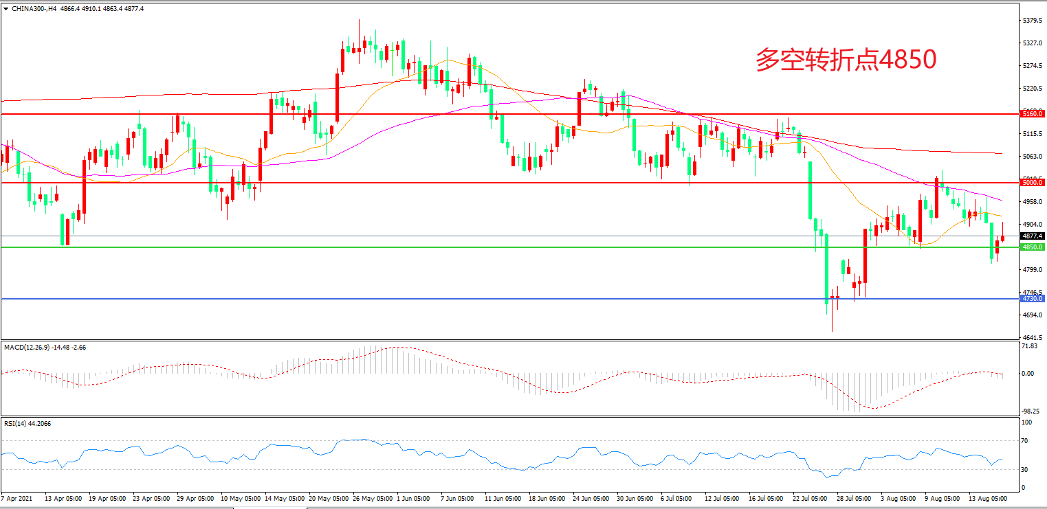 4小时图看,沪深300长阴下破后小幅回调,短线行情有所回暖,4850成为短期多空分水岭,MACD绿柱增加,RSI指标走平,日内震荡下行概率较大。