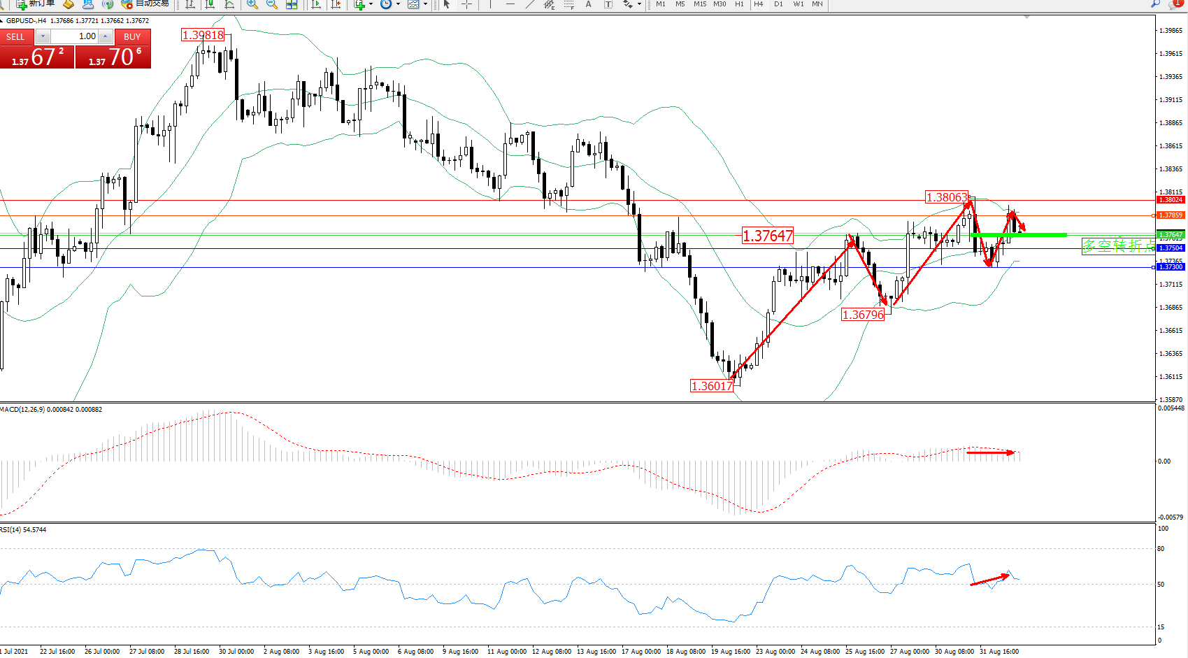 交易策略:1.37647上方看涨,目标1.37859、1.38024