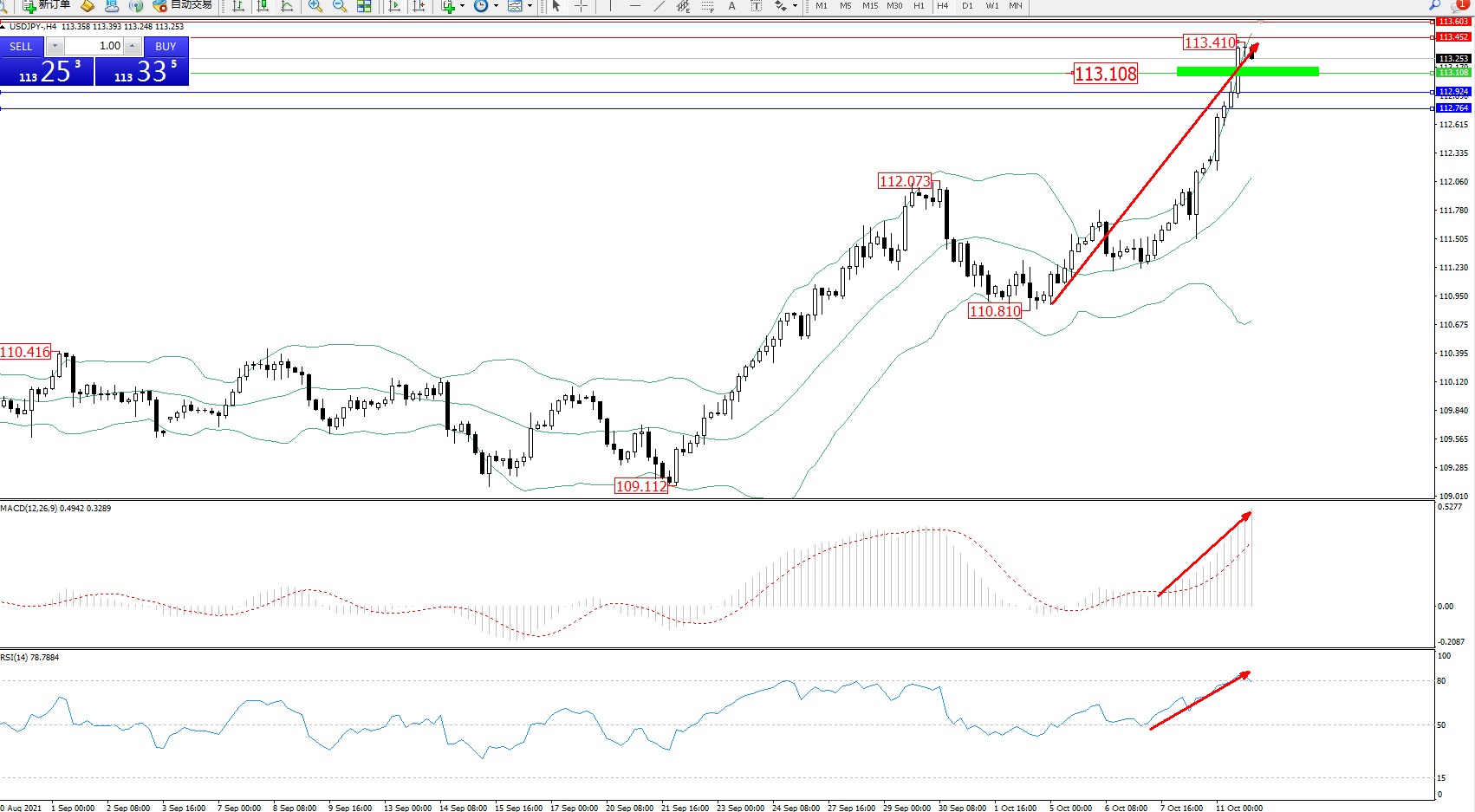 技术点评:多头动力延续布林带指标上轨附近持续震荡上扬,高位抵达113.410位置后有进一步向上移动态势,短期多头动力未见最终止步迹象,布林带指标呈张口走势态势良好,MACD指标处于多头区域持续拉升上扬中,RSI指标处于多头区域持续震荡上移至超买区80均衡线上側弱势徘徊;