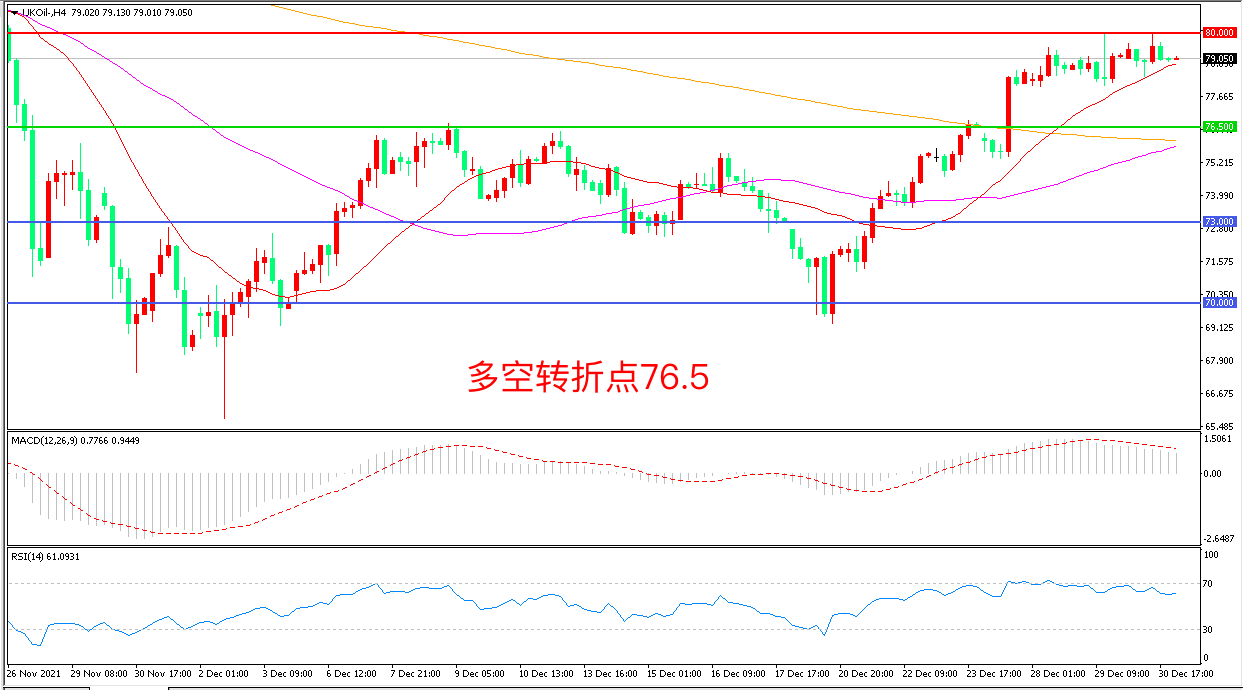 交易策略:在76.50之上看涨,目标80. 00               83.00