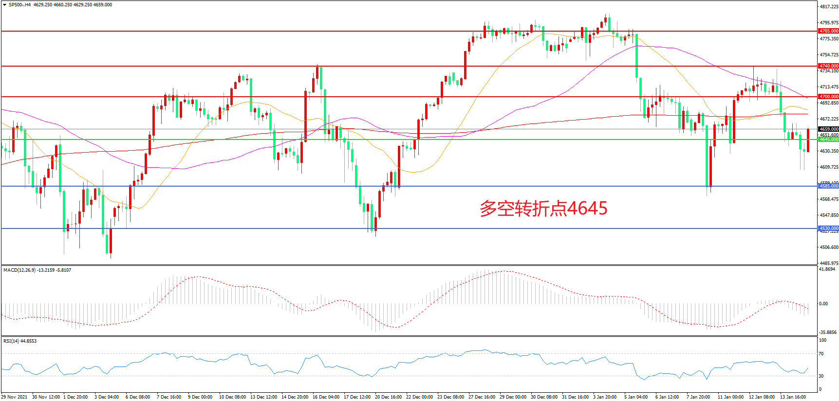 4小时图看,标普500长阴下探后再度回升,短期走势有所回暖,4645成为多空分水岭,200周期均线成为上方阻力,MACD绿柱增加,RSI指标走平,日内震荡下行概率较大。