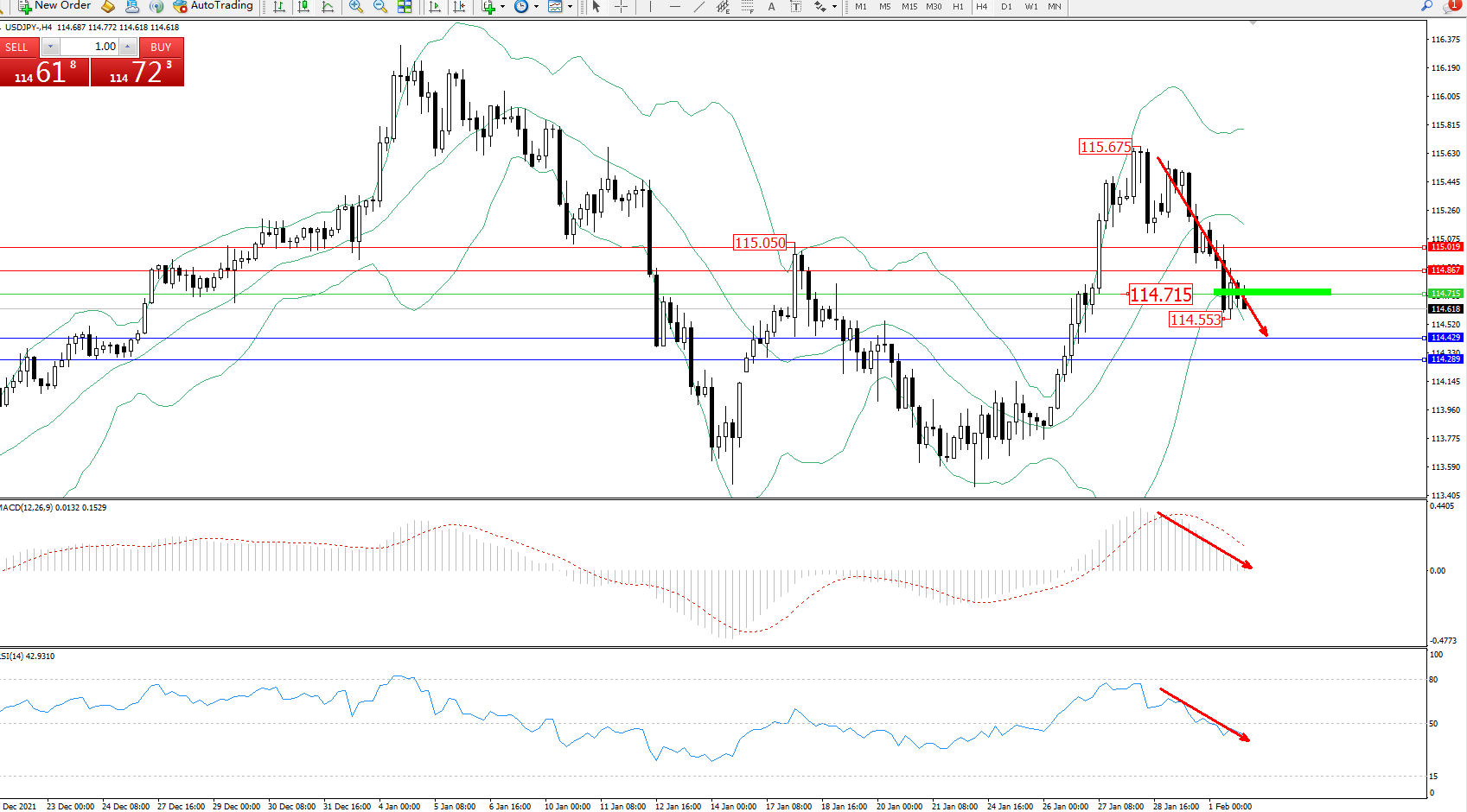 交易策略:114.715下方看跌,目标114.429、114.289