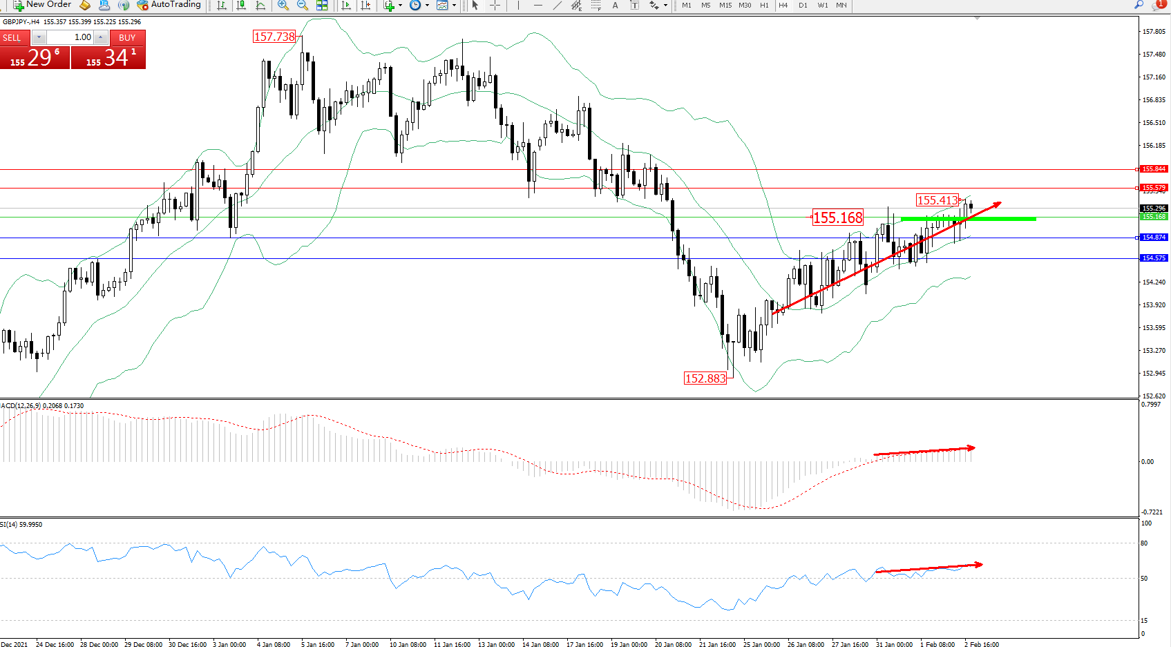 交易策略:155.168上方看涨,目标155.579、155.844