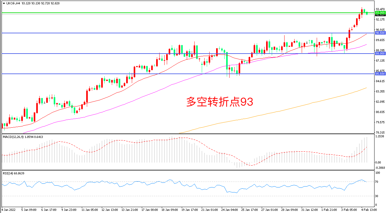4小时图看,油价长阳连续拉升,短期走势偏强,89美元成为下方支撑,93美元成为多空分水岭,MACD红柱增加,RSI指标走平,日内震荡上行概率较大。