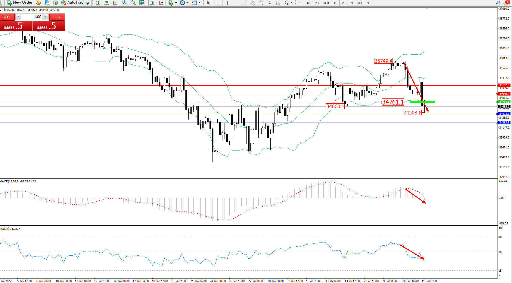 道琼斯指数2月11日(周五)收盘下跌503.66点,跌幅1.43%,报34737.93点;美国股市周五下跌,在美国警告俄罗斯最早可能下周对乌克兰采取军事行动后,投资者寻求避险。俄罗斯-乌克兰紧张局势升温使风险资产受挫,本来市场已经受通胀数据和美联储官员鹰派言论打击了。伴随市场对新闻作出反应,未来几周我们可能面临更多下行风险。投资者担心经济刚好在最糟糕的时候放缓,正值美联储即将加息,这可能对经济健康增长和牛市构成威胁,加之地缘政治局势紧张,这是市场波动的很大原因。