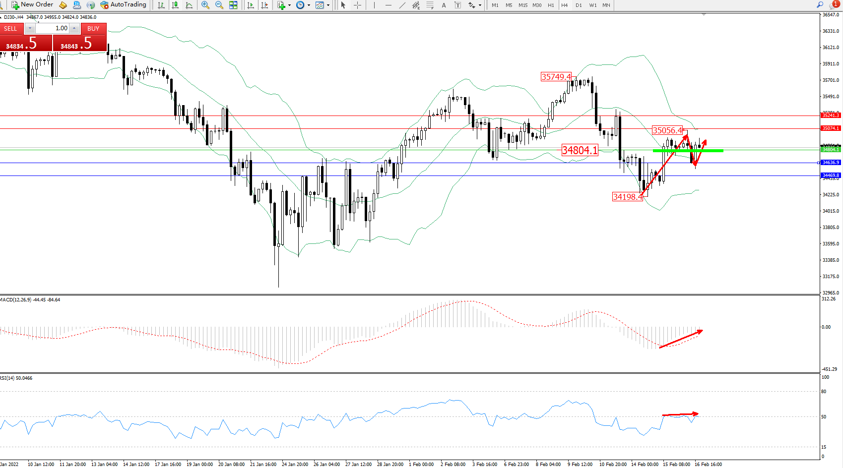 道琼斯指数DJ30——4小时K线图显示: