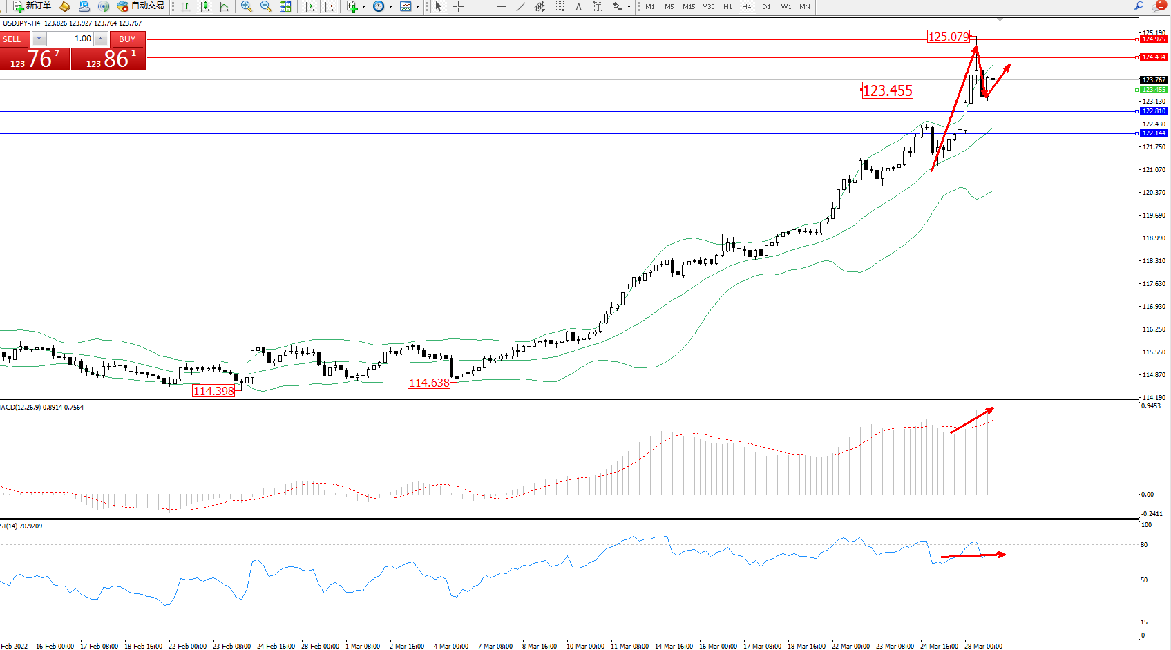 交易策略:123.455上方看涨,目标124.434、124.975