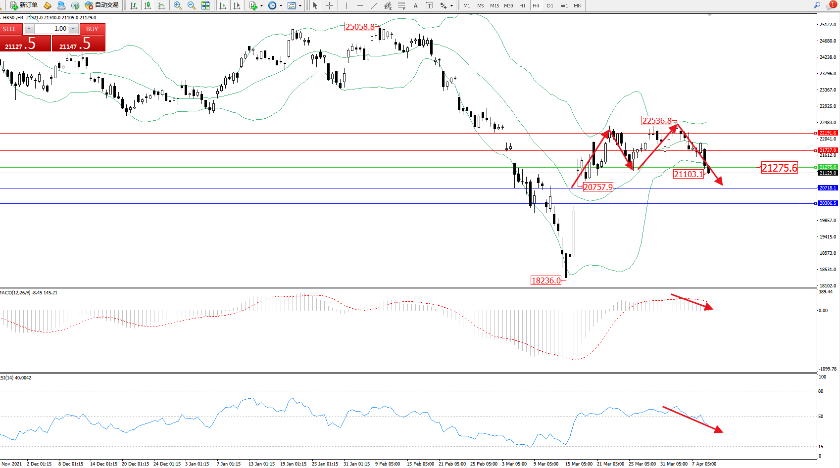 技术点评:短期纠结于布林带指标通道中上轨区间震荡,波幅空间逐渐收窄,期间多次来回刺探中上轨区间节点,市场空头动力伺机而动,下挫破布林带指标下轨至21103位置后有继续下行态势,布林带指标呈收口走势持续平移后开始缓慢张口,MACD指标处于多头区域维持震荡平移后缓慢下行至0轴线附近徘徊,有继续下行态势,RSI指标维持窄幅整理下行破50均衡线进入空头区域徘徊中。