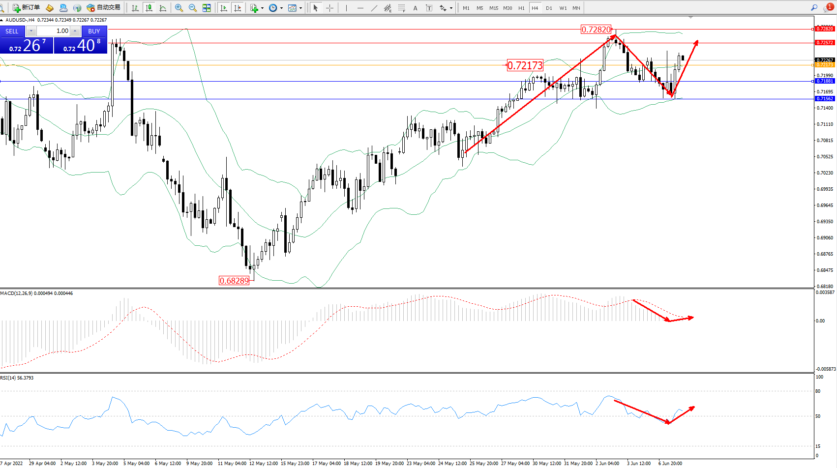 交易策略:0.72173上方看涨,目标0.72572、0.72820
