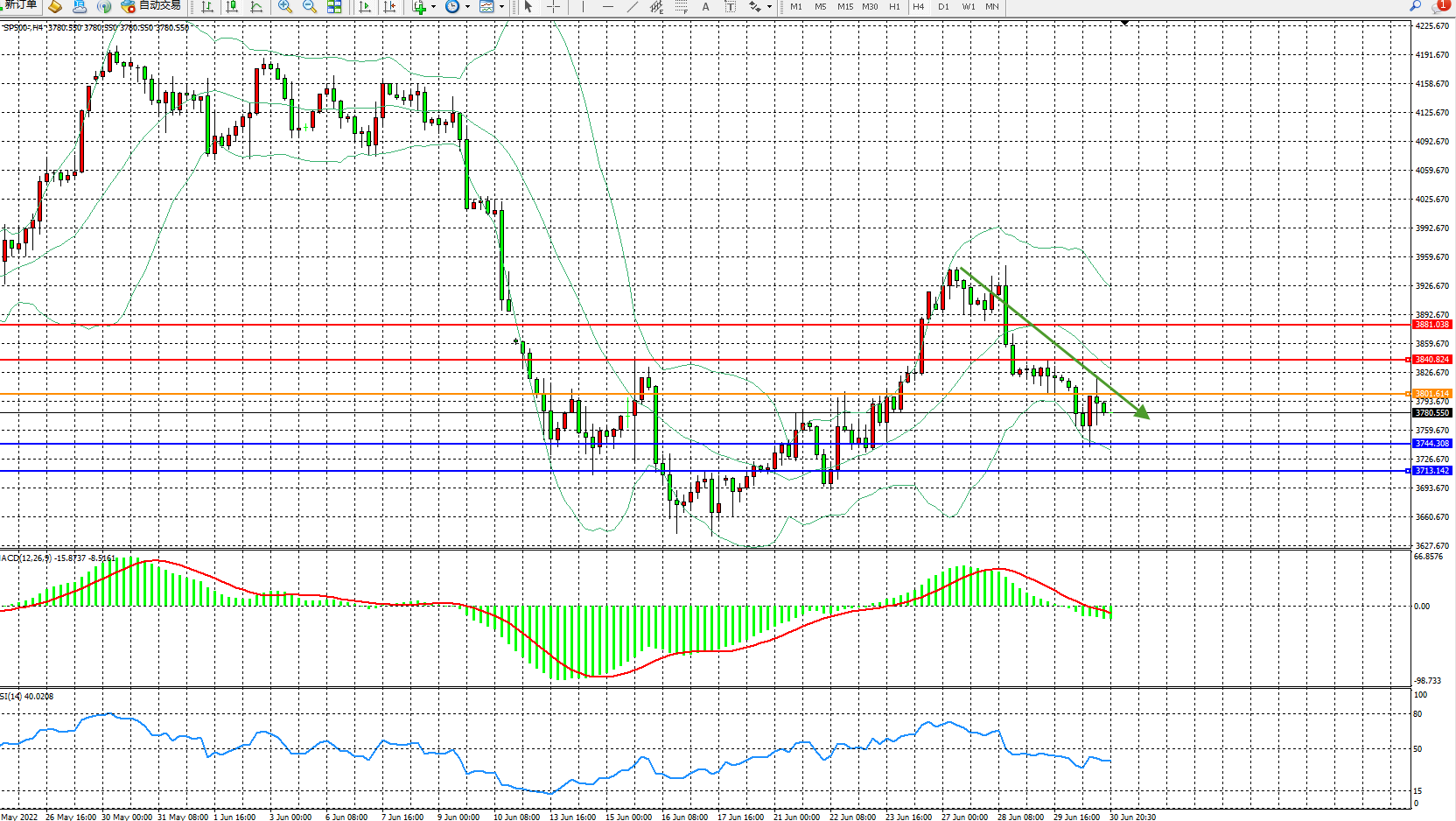 标普SP500——4小时K线图显示: