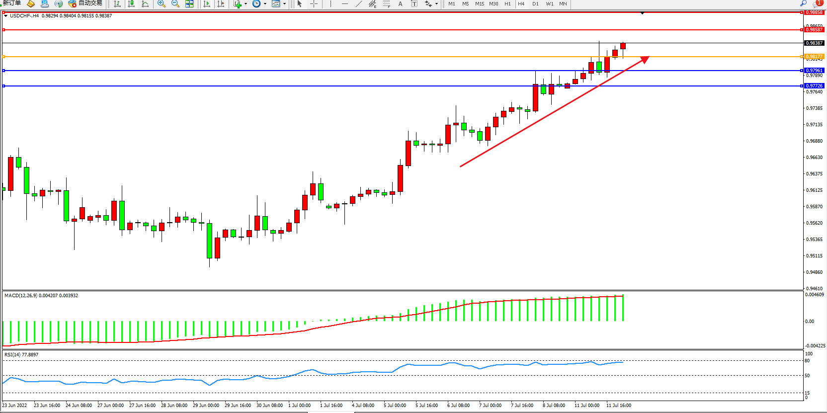 美元瑞郎USDCHF——4小时K线图显示: