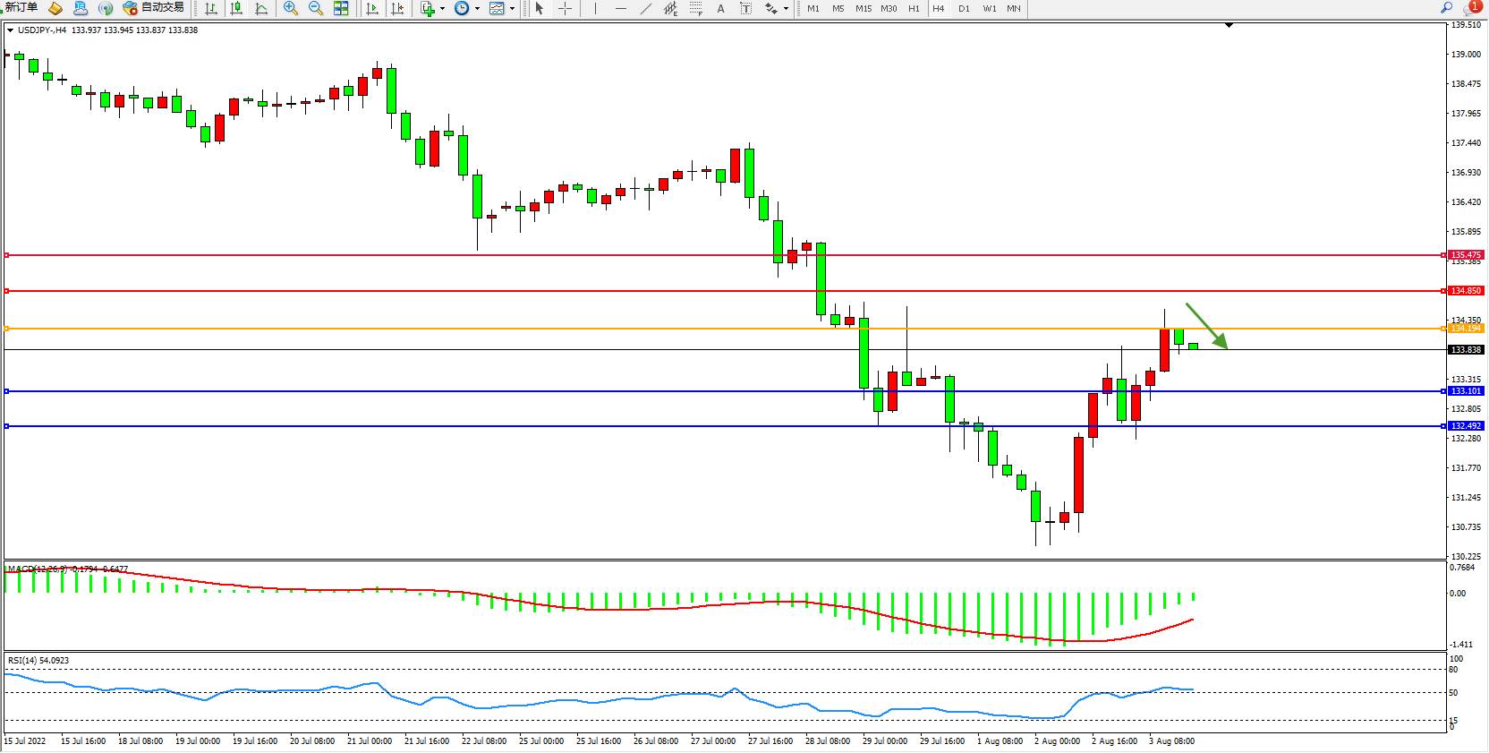 交易策略:134.194下方看跌,目标133.101、132.492