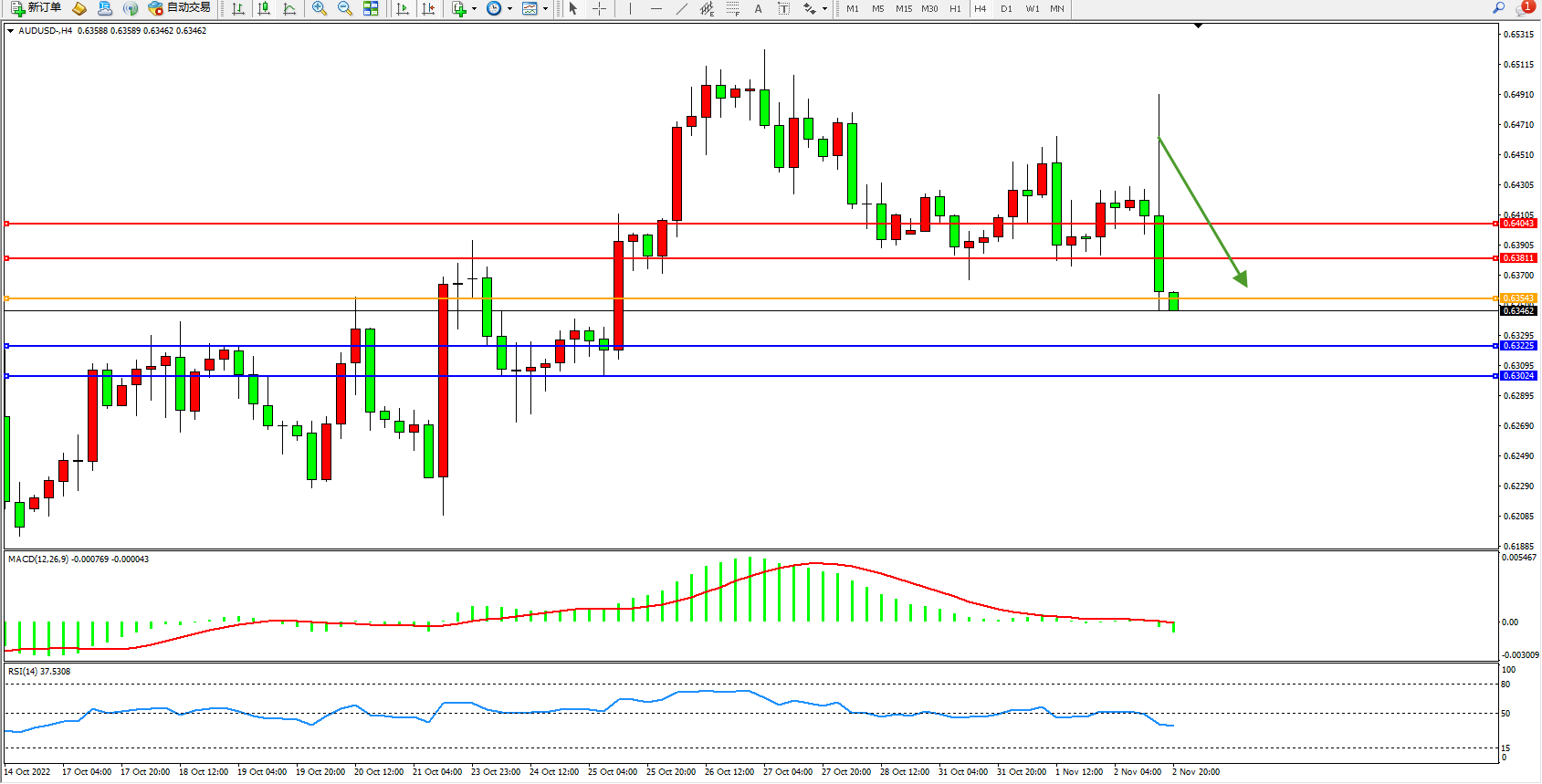 澳元美元AUDUSD——4小时K线图显示: