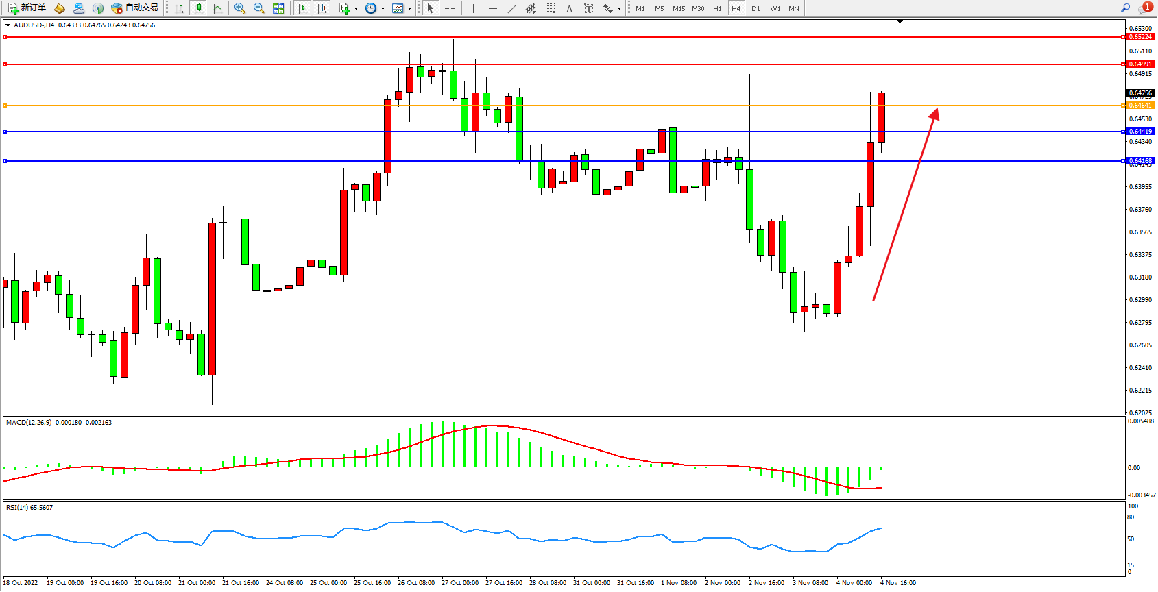 交易策略:0.64641上方看涨,目标0.64991、0.65224