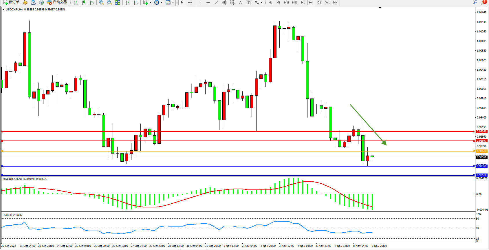 交易策略:0.98678下方看跌,目标0.98358、0.98160