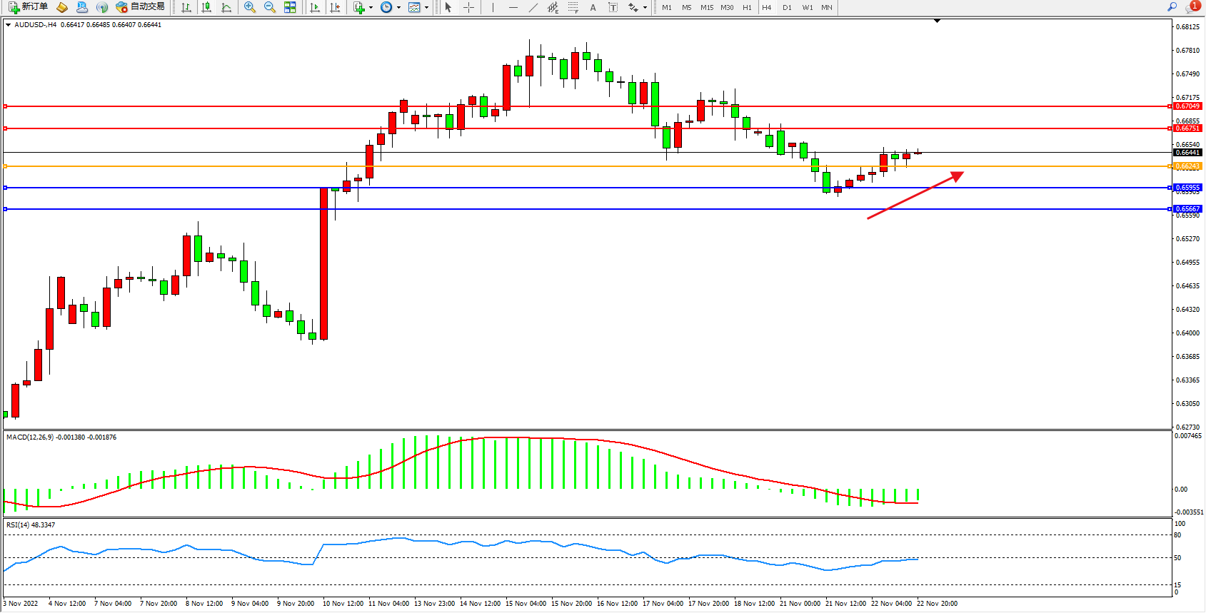 澳元美元AUDUSD——4小时K线图显示: