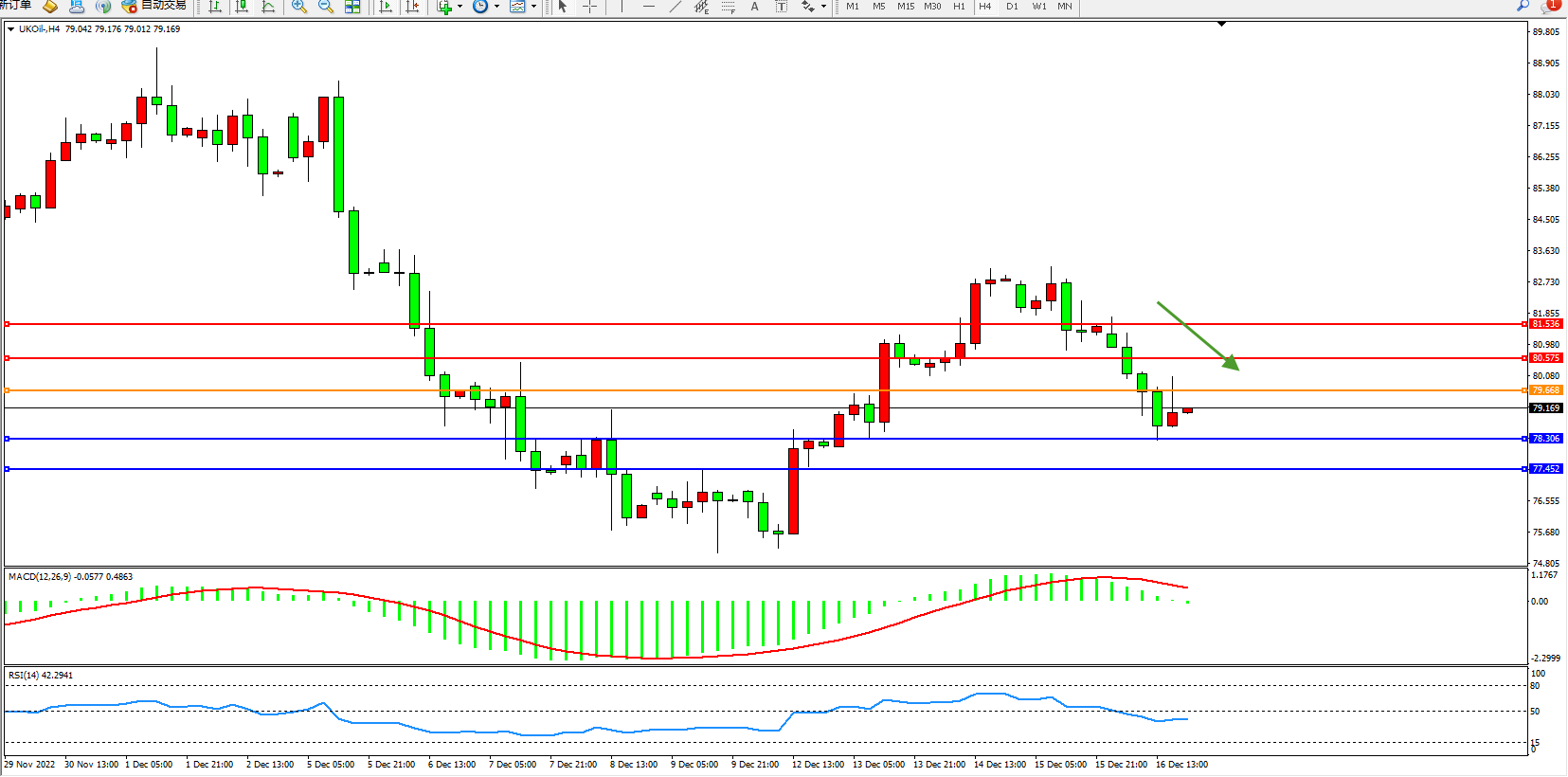 布油维持79.169附近震荡,石油在今年年底遭遇坎坷,各国央行在本周的关键利率决定中都采取了鹰派的基调。进一步紧缩的前景给风险资产带来了阻力。