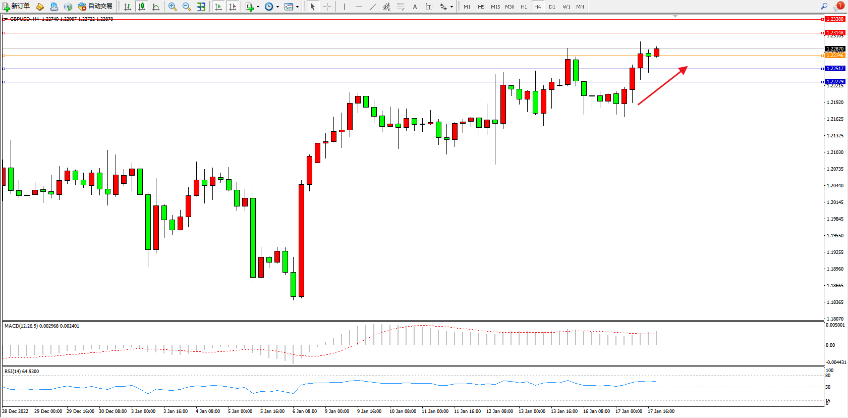 交易策略:1.22746上方看涨,目标1.23148、1.23388