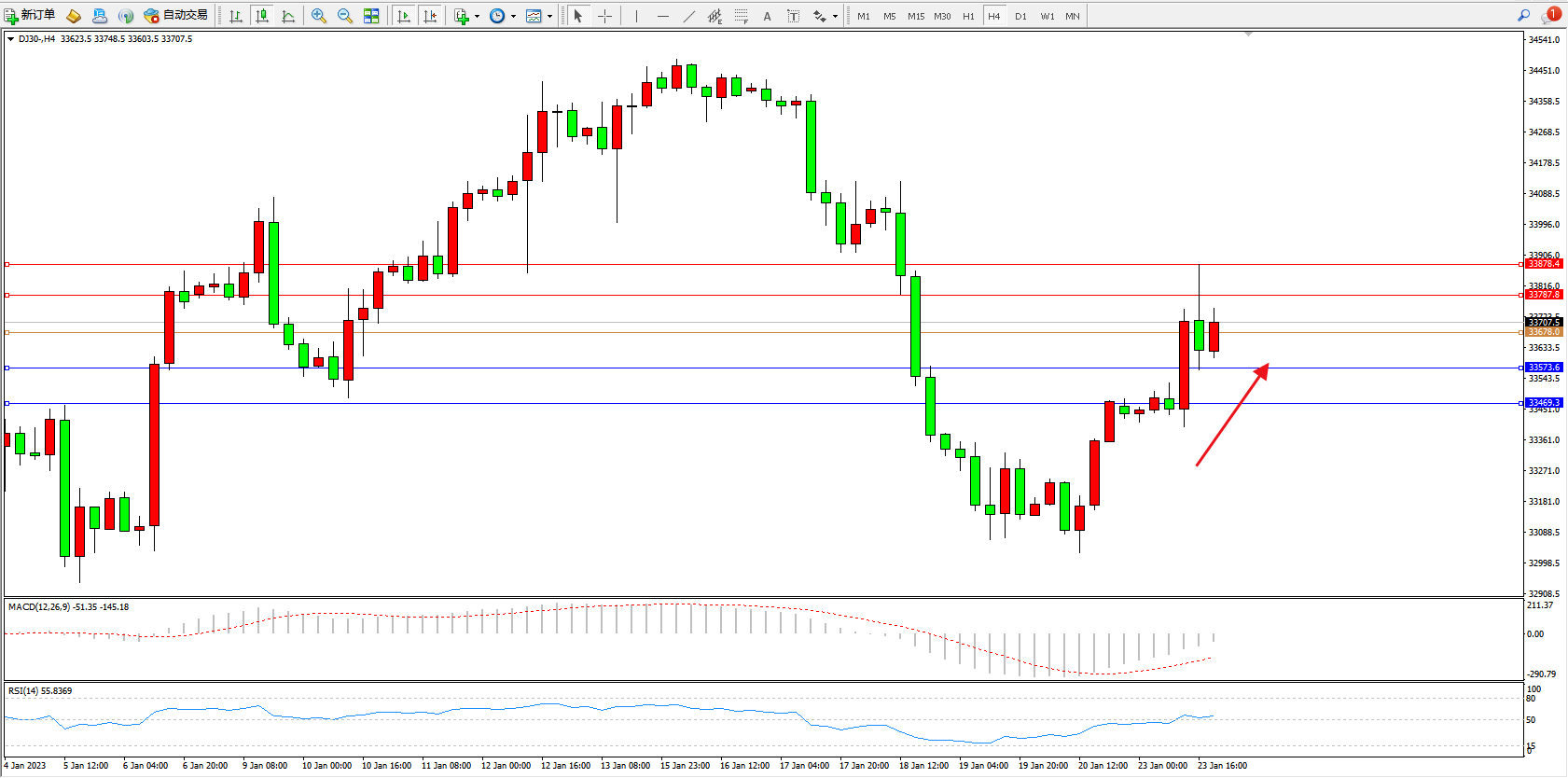 道琼斯指数DJ30——4小时K线图显示: