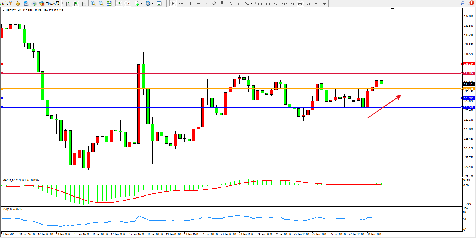 交易策略:130.249上方看涨,目标130.804、131.144