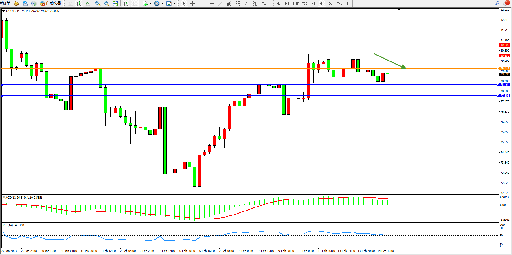 备选策略:79.417上方看涨,目标80.168、80.809