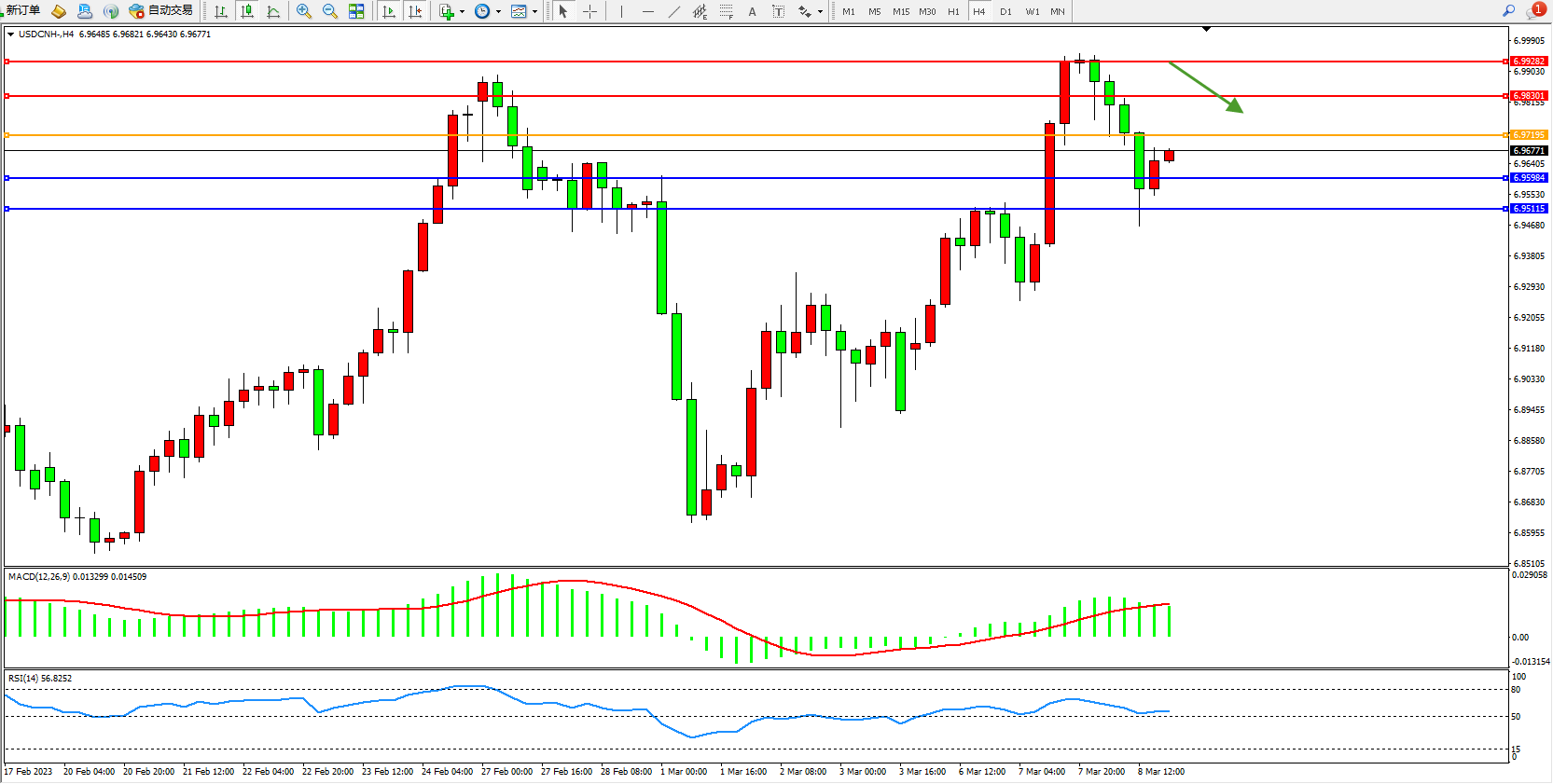 备选策略:6.97195上方看涨,目标6.98301  6.99282