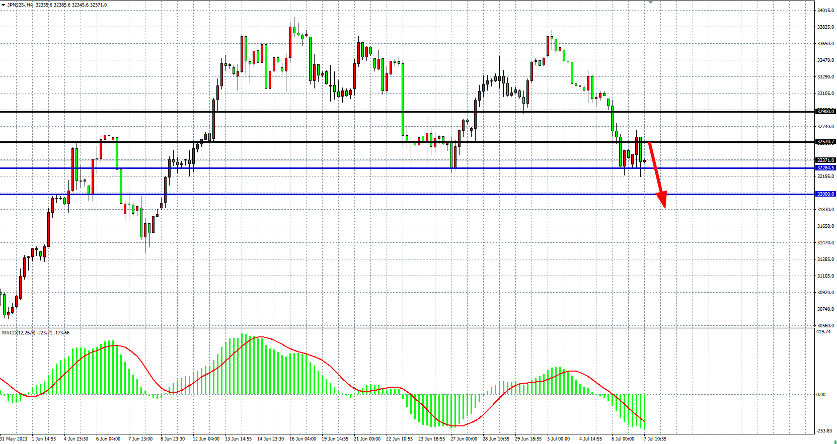 4小时图看,日经指数再度跌至32300附近,MACD量能在零轴下继续放量,空头行情延续。