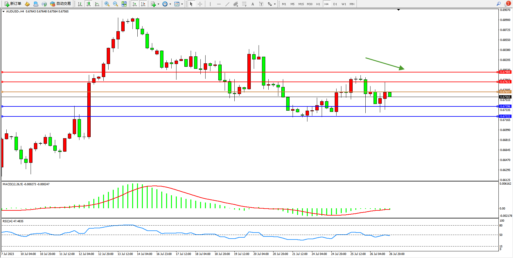 交易策略:0.67647下方看跌,目标0.67396 0.67222