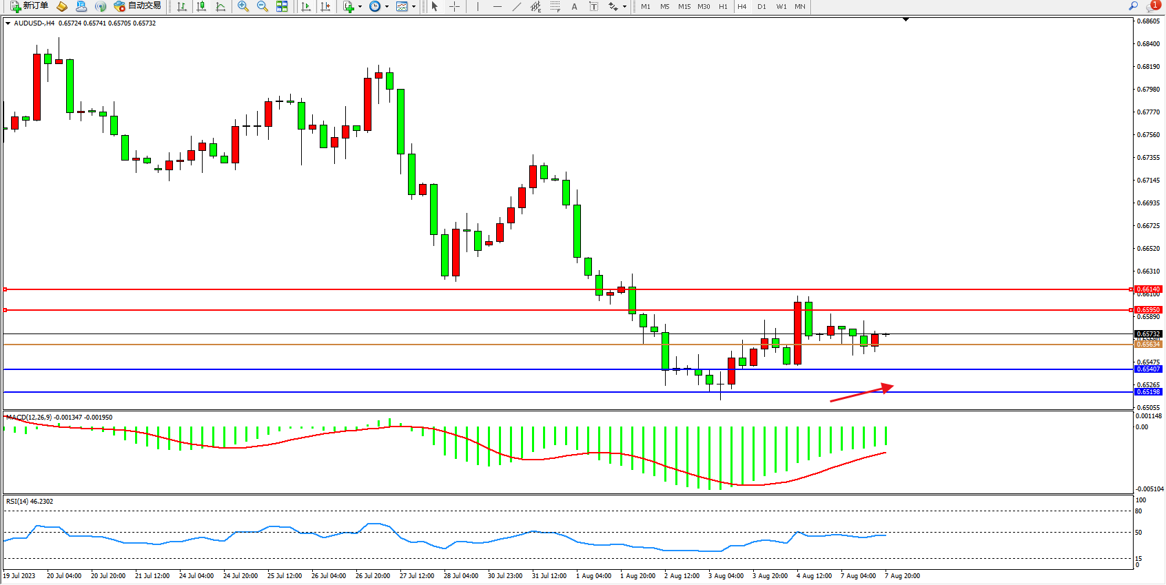 澳元美元AUDUSD——4小时K线图显示: