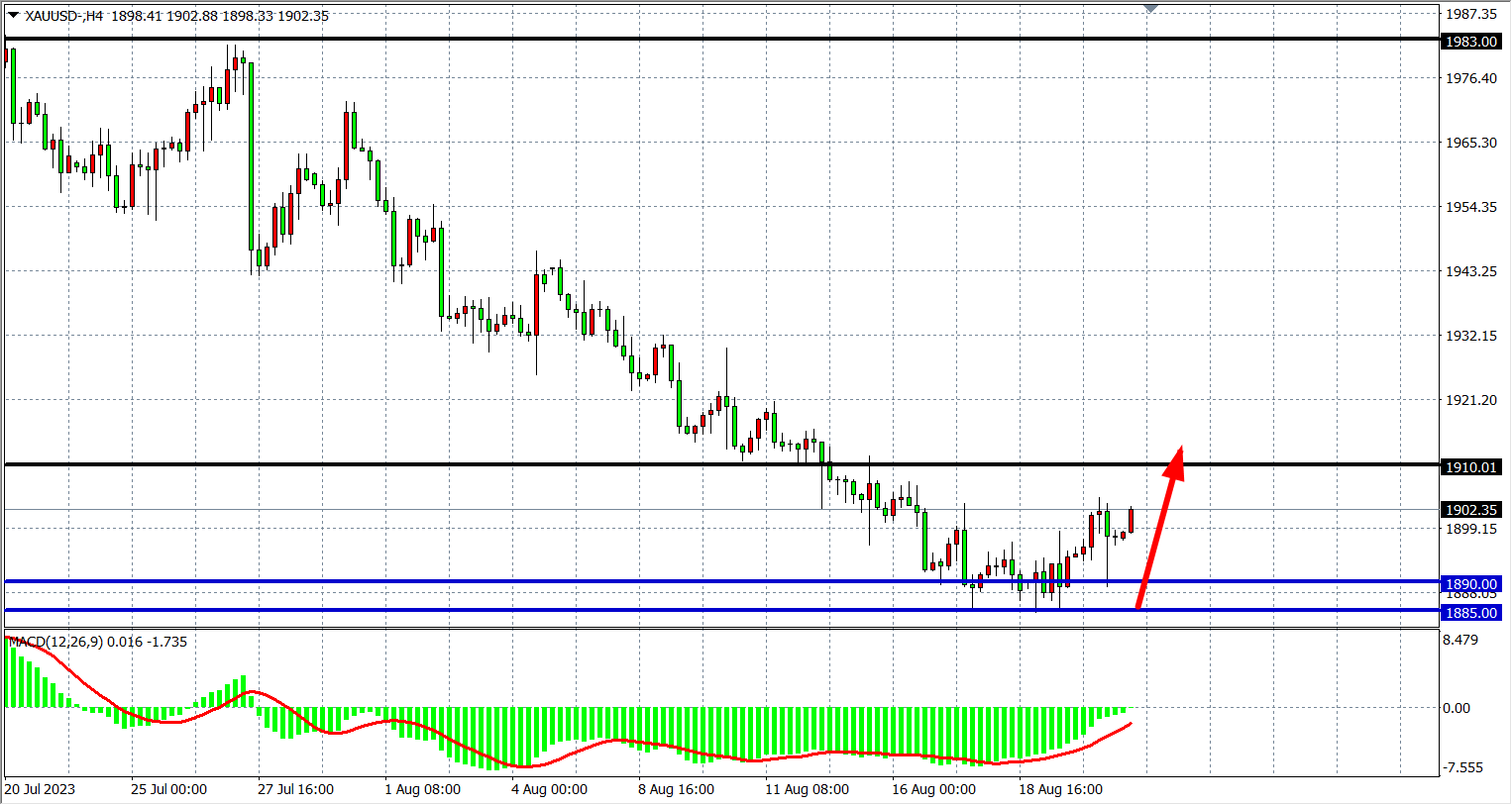 4小时图看,黄金在1900关口附近盘整,MACD量能在零轴下缩量,短线走势有望转多头,支撑关注下方1885-1890附近,阻力关注上方1910-1920。