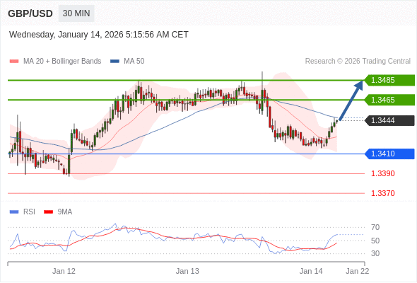 在 1.3410 之上,看涨,目标价位为 1.3465 ,然后为 1.3485 。